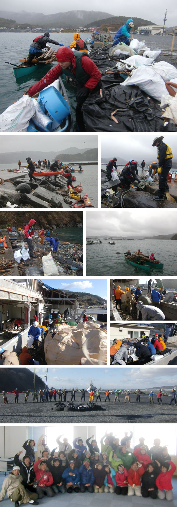 ●日時 2011年12月3日(土)〜4日(日) 4日は暴風のため陸作業 ●場所 牡鹿半島・小渕浜・ありあての浜 →MAP ●参加人数 のべ70名 ●参加団体 パタゴニア、Saltys paddle sport、RAINDOG SEAKAYAK SKILL SERVICE、 SURFACE、 RQ、 ピースボート ●カヌー 13艇 シーカヤック 14艇 ●作業内容 湾内に浮かぶ瓦礫の撤去、漁具の回収。防波堤上の瓦礫の撤去、運び出し。牡蠣剥き場の清掃。
